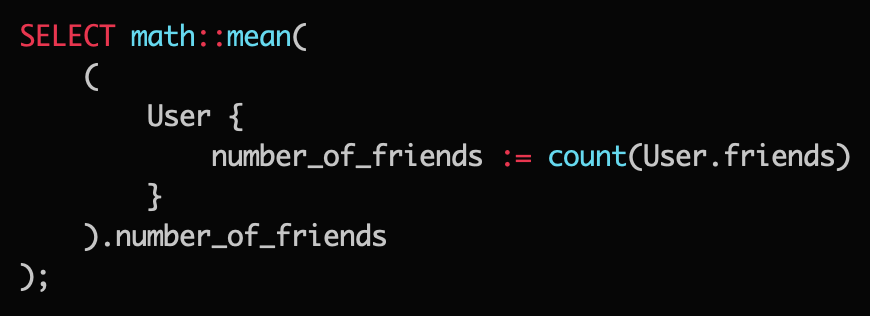 What about calculating how many friends a user have on average? That's easy: just wrap the first query in an aggregate function:pic.twitter.com/1CJzQyHqmd