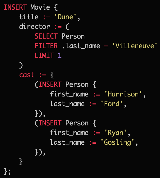 INSERTs and UPDATEs in EdgeQL can be nested. This is convenient to add/modify deep object hierarchies. Any EdgeQL single statement is always atomic even if it contains nested operations.pic.twitter.com/MxmtZ78OSl
