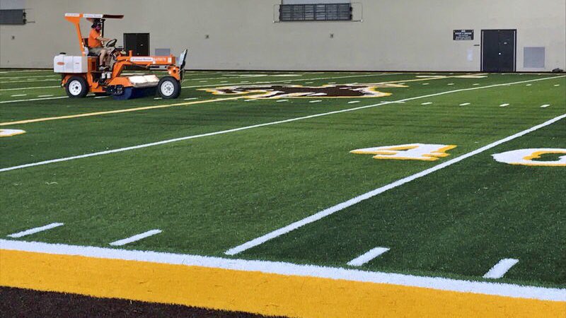 New turf being installed for the indoor practice facility at the University of Wyoming. This is the same field design as War Memorial Stadium, including the numbering and midfield Steamboat logo!