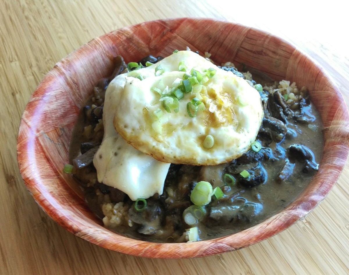 #Locomoco@juicybrew in#Kaimuki on#Waialae.#Plantain#BlackEyedPeas#burger w/ savory#local#mushroom#gravy topped w/ a#organic#eggpic.twitter.com/nSbRZtQPh6