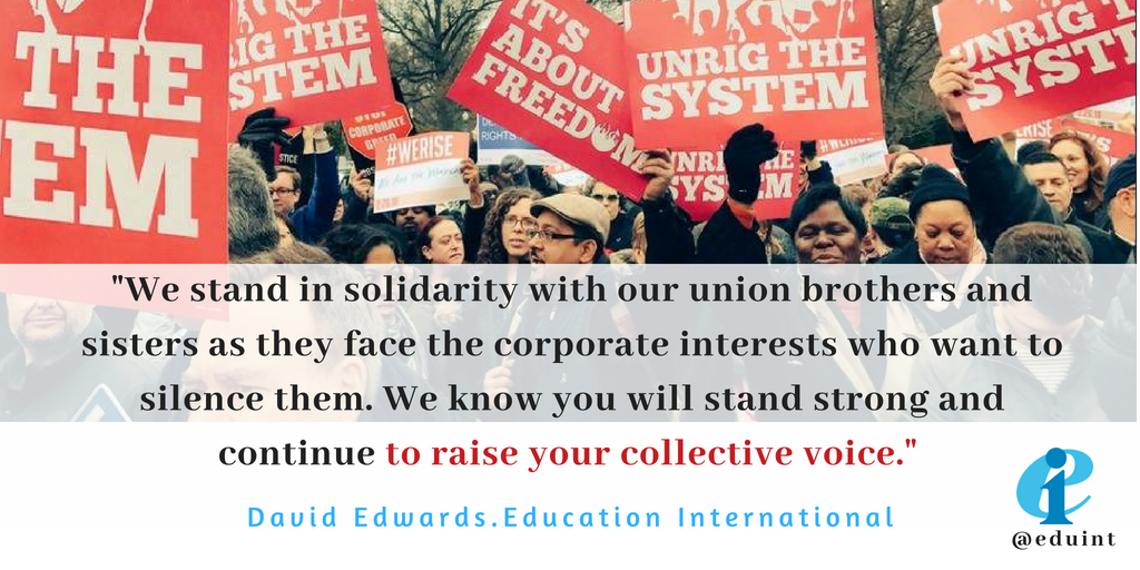 We stand in solidarity with our union brothers and sisters in the U.S. as they face the corporate interests who want to silence them. We know you will stand strong and continue to raise your collective voice says @daveswords #Union #Janus #UnionStrong @NEAToday @AFTunionpic.twitter.com/1gmv6B085V