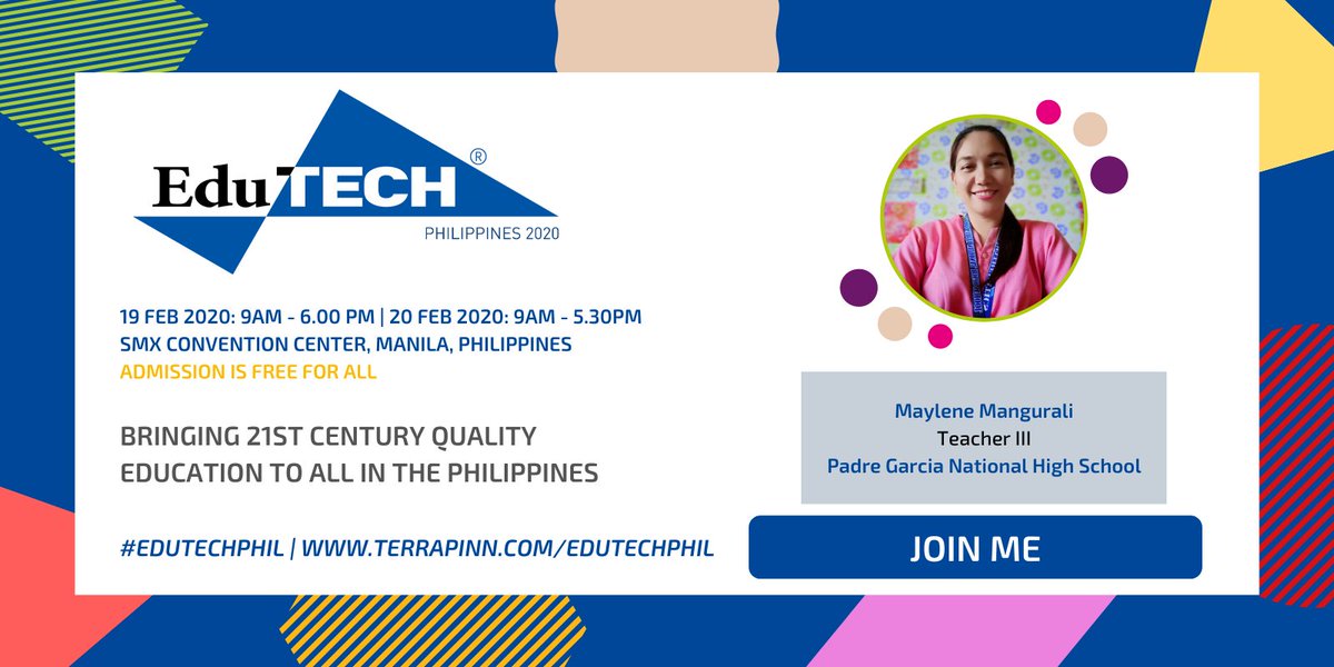 #EduTECHPhil and get ready to learn from Janette Magalona of Philippine Normal University Visayas on 19-20 February at SMX Convention Center, Manila, Philippines! She will be sharing her insights at#teachtechtalks. Get your free pass now at http://bit.ly/2RbRSi2 pic.twitter.com/spazehUZAX