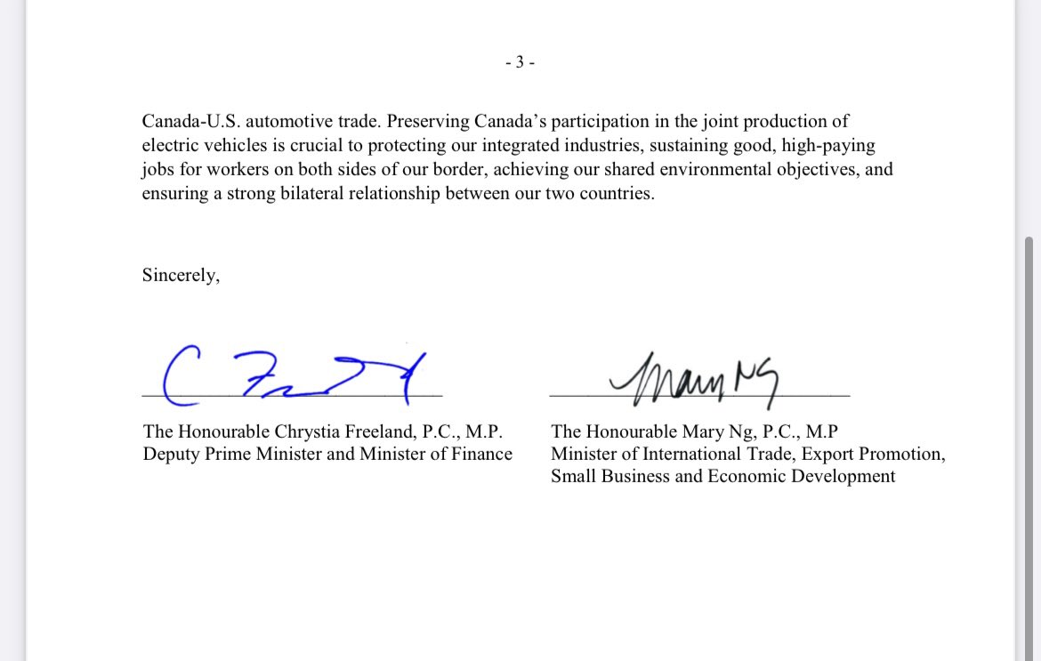 DPM “Chrystia Freeland has written to top U.S. senators threatening to suspend parts of the USMCA trade agreement and impose tariffs on American goods unless U.S. officials back away from a proposed tax credit for American-built electric vehicles.”https://www.cbc.ca/news/politics/freeland-ng-threatens-us-senators-1.6281713 …