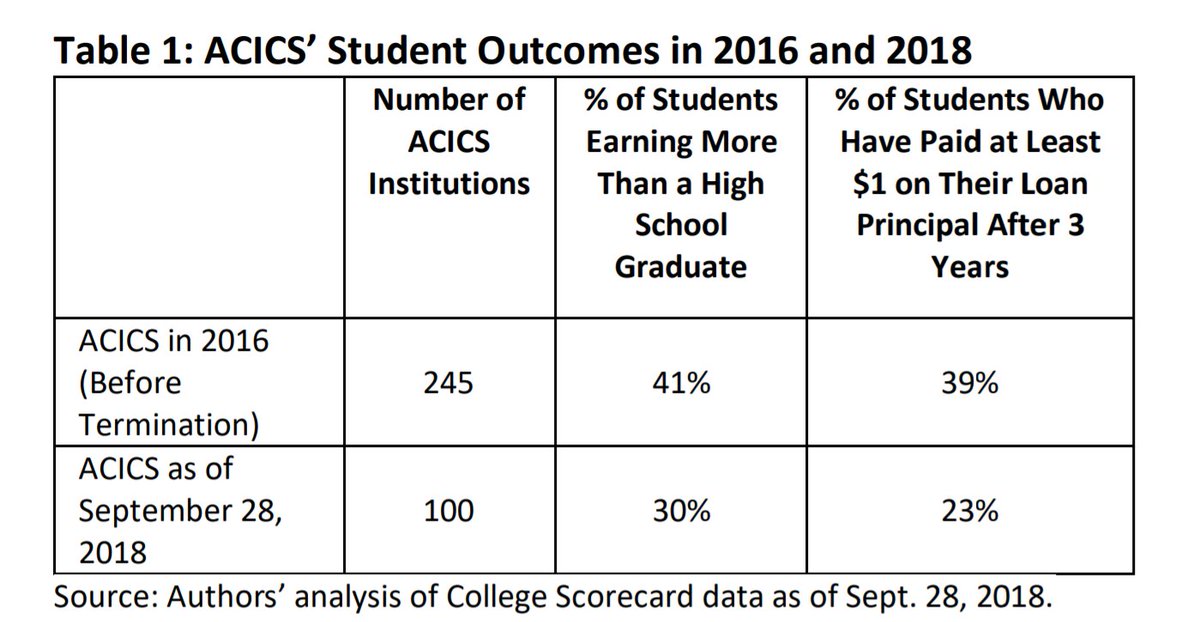 The report found: 1. 70% of students at ACICS-approved colleges end up earning no more than a high school graduate who doesn't go to college at all. 2. Students at ACICS-approved colleges are 2x as likely to have unmanageable debt. This is costing both students and taxpayers.pic.twitter.com/X9ot0G4aIa