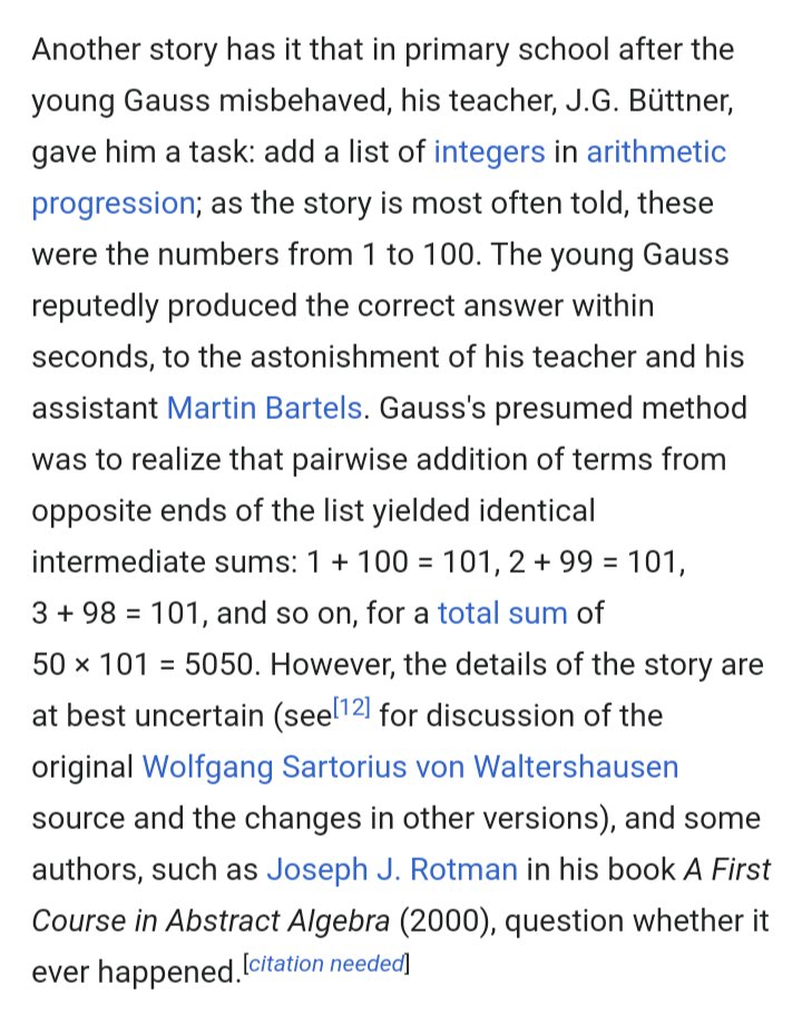 reminiscing now my most impressive childhood smart thing that's legible is that in third grade my teacher threw us the gauss arithmetic problem and i figured out how to do it the smart way with no prompting i have since made zero contributions to mathematics. oh wellpic.twitter.com/k2Ergxf2ij
