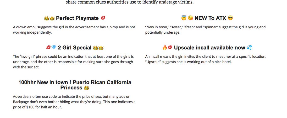 Here are the codes & emojis that suggest a girl being sold for sex online is underage: https://apps.texastribune.org/sold-out/backpage/ …pic.twitter.com/Md4cZHvSeF