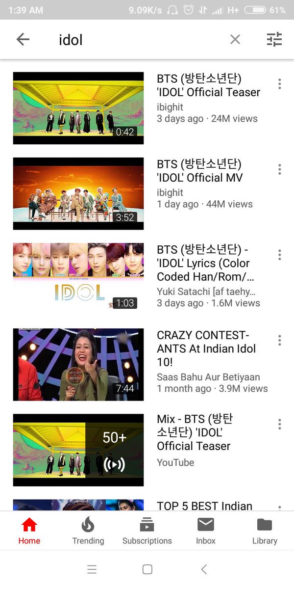 This is very fishy bc when I searched "IDOL" the first picture appeared which is showing 44M views and when I searched "IDOL BTS" the second picture appeared which is showing 61M ! Now I'm frightened as heckpic.twitter.com/0Bz266uz2Z