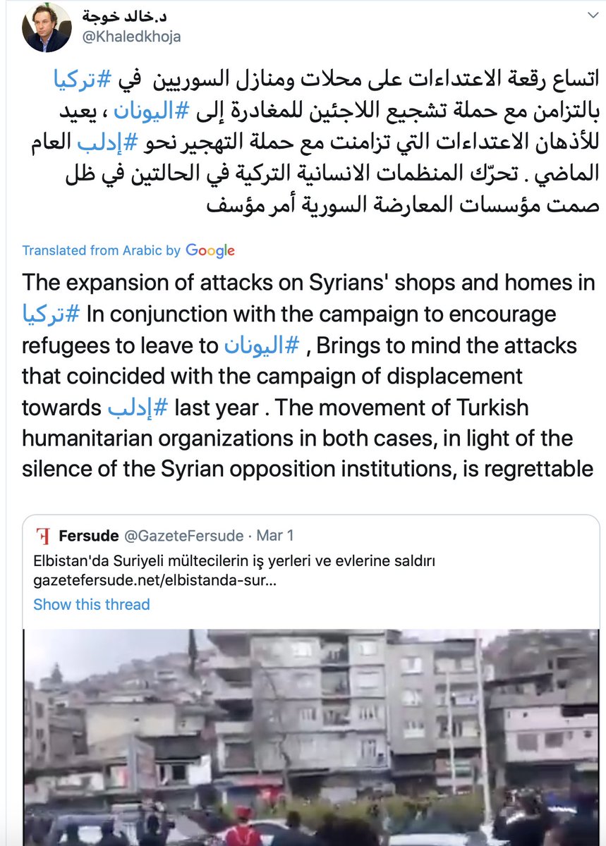 #Syria #Turkey Syrian opposition leader criticising Turkey for the attacks against Syrian refugees' homes and shops and how Turkey is encouraging Syrian to leave to #Greece. He is accusing the state behind organising the refugee forced departure to blakmail #Europe.pic.twitter.com/L1BgLTBg0a