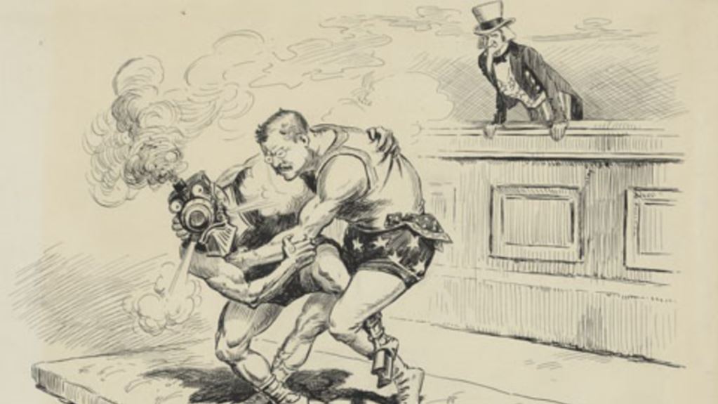 Every political cartoon is bad except this one where Teddy Roosevelt wrestles a Man-Train in front of Uncle Sam, who's super into itpic.twitter.com/YwEpNVflQP