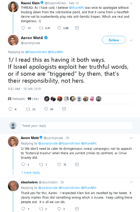 I've been looking at "progressives" reactions to Omar's apology, and the hypocrisy and hate are off the charts. When Naomi Klein says that her apology was needed to put this behind her, this @thenation writer @aaronjmate says this:pic.twitter.com/7dooU7TpDT