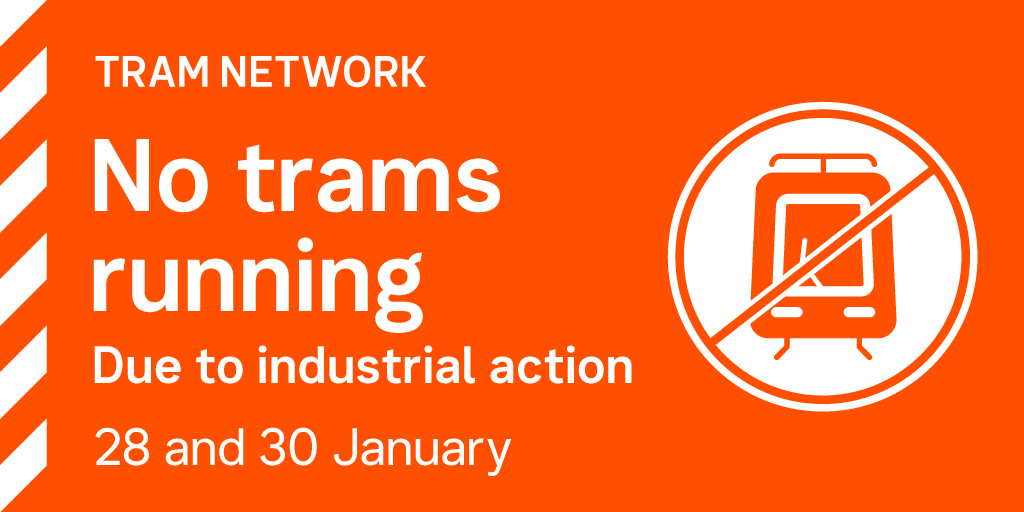 Reminder: due to industrial action on Tues 28 and Thurs 30 January, no trams will run between 10am and 2pm. Passengers are advised to plan ahead and check for updates before travelling. Visit our website for details about alternative travel options: https://bit.ly/2NKEu21 pic.twitter.com/OY6jtD1Eof
