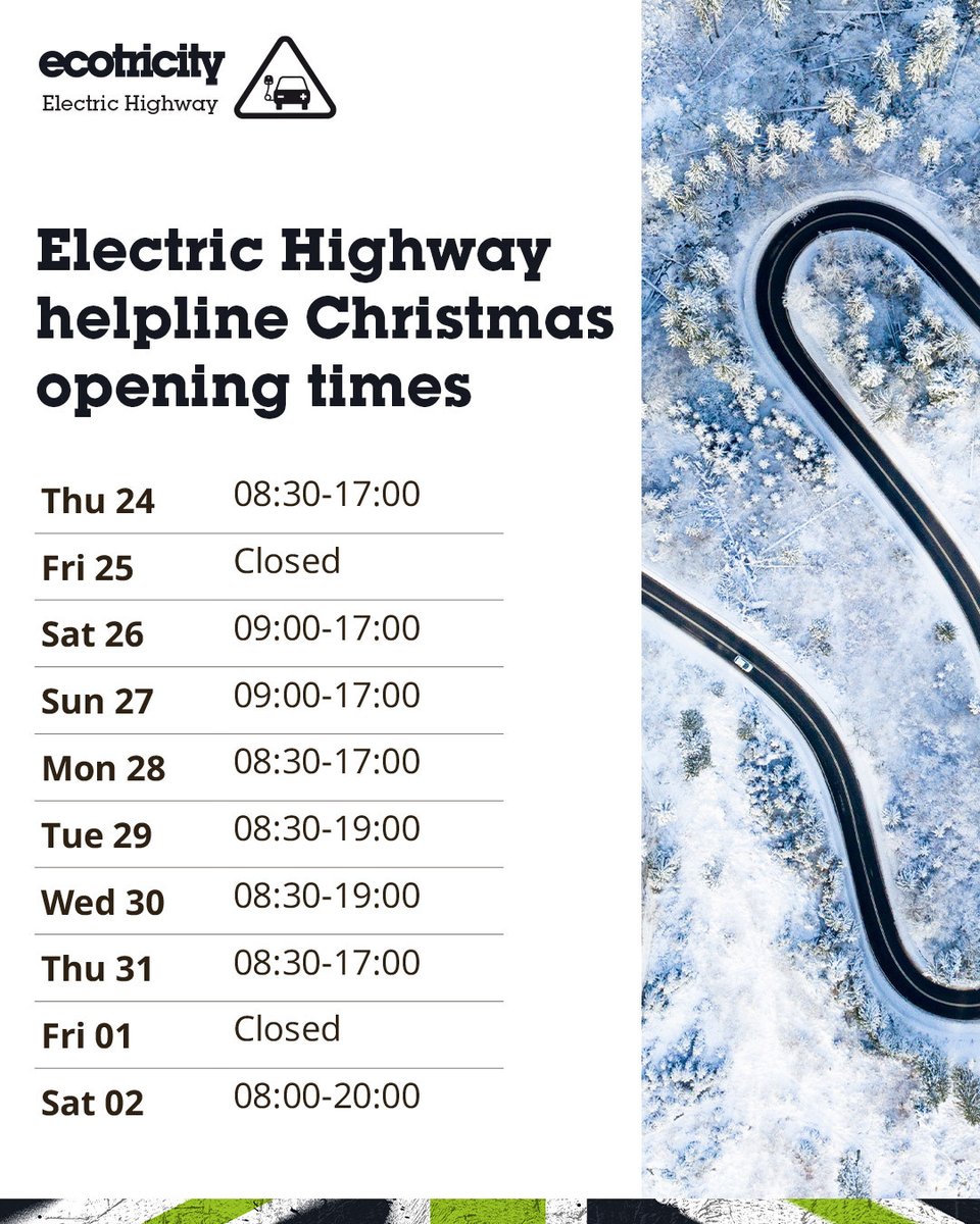Due to a technical issue, the Electric Highway helpline will be closing tonight at 6pm. Operating hours will return to normal tomorrow.