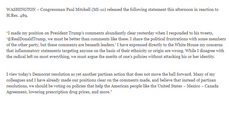 I view today’s Democrat resolution as yet another partisan action that does not move the ball forward. Many of my colleagues and I have already made our positions clear on the comments made. https://mitchell.house.gov/media/press-releases/mitchell-reaction-hres-489 …pic.twitter.com/UZPdTIXKrl