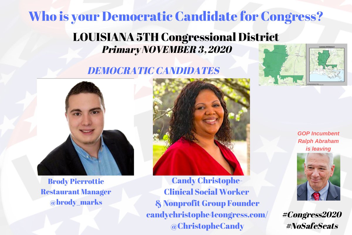 LA5 GOP Ralph Abraham is leaving Louisiana District 5! Democratic Candidates for #LA5 are Candy Christophe Clinical Social Worker & Nonprofit Group Founder http://www.candychristophe4congress.com/  @ChristopheCandy Brody Pierrottie Restaurant Manager @brody_marks #DemCastLA #Congress2020 THREADpic.twitter.com/P7tArKg9cT