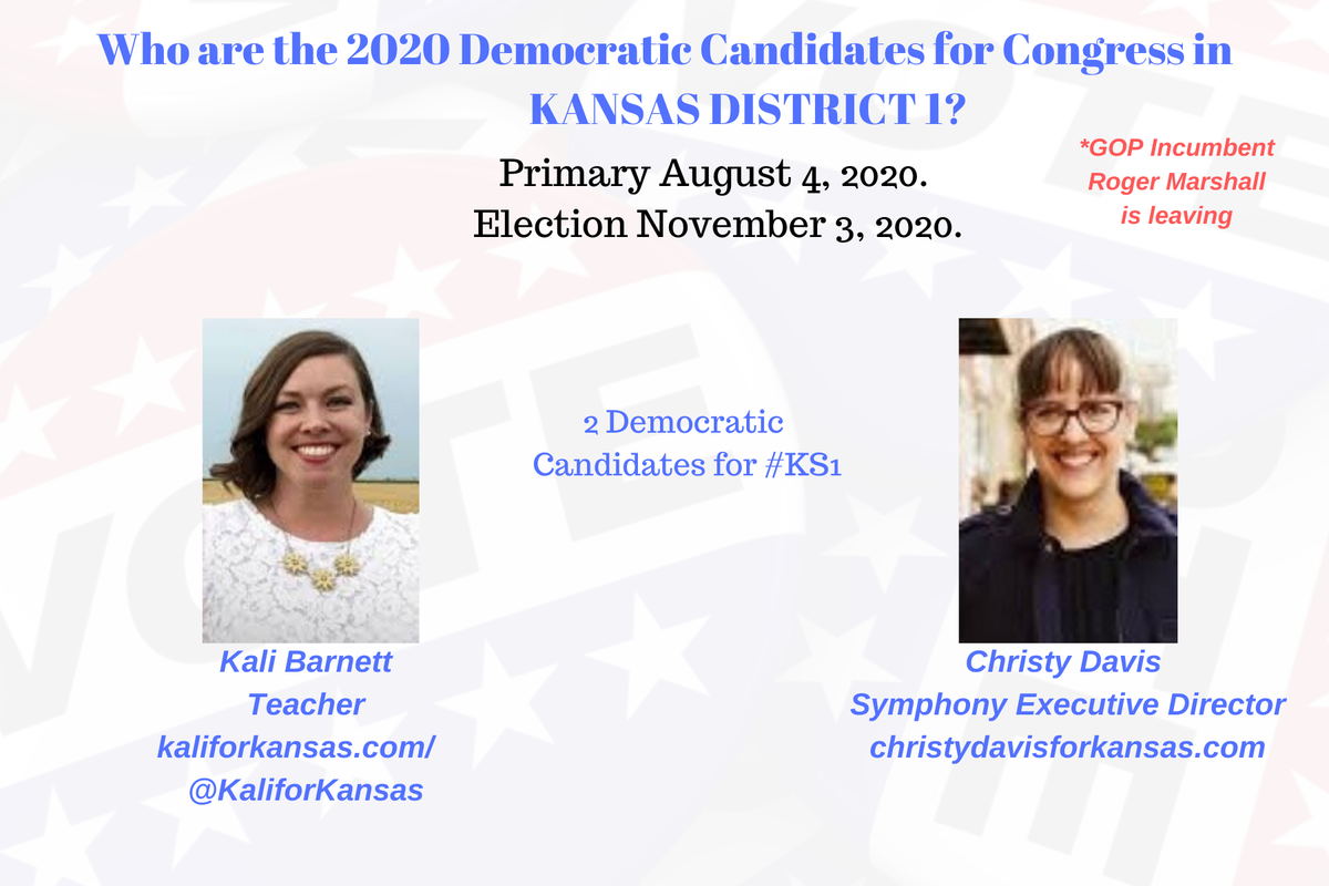 KS1 GOP Roger Marshall @RogerMarshallMD is leaving Kansas District 1 Democratic Candidates for #KS1 are Kali Barnett @KaliforKansas https://kaliforkansas.com/  Christy Davis https://www.christydavisforkansas.com/  Primary August 4, 2020 #DemCastKS #Congress2020 #VoteBlueToSaveDemocracy THREADpic.twitter.com/KV20FnE49M