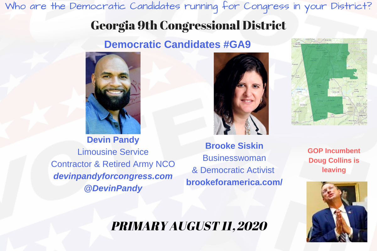 GA9 Democratic Candidates GEORGIA 9th CONGRESSIONAL DISTRICT #GA9 #GA09 Devin Pandy https://devinpandyforcongress.com  @DevinPandy Brooke Siskin http://www.brookeforamerica.com/  GOP Incumbent Doug Collins is leaving #Congress2020 THREAD Primary Runoff AUGUST 11, 2020pic.twitter.com/z8FdDZ3aHR