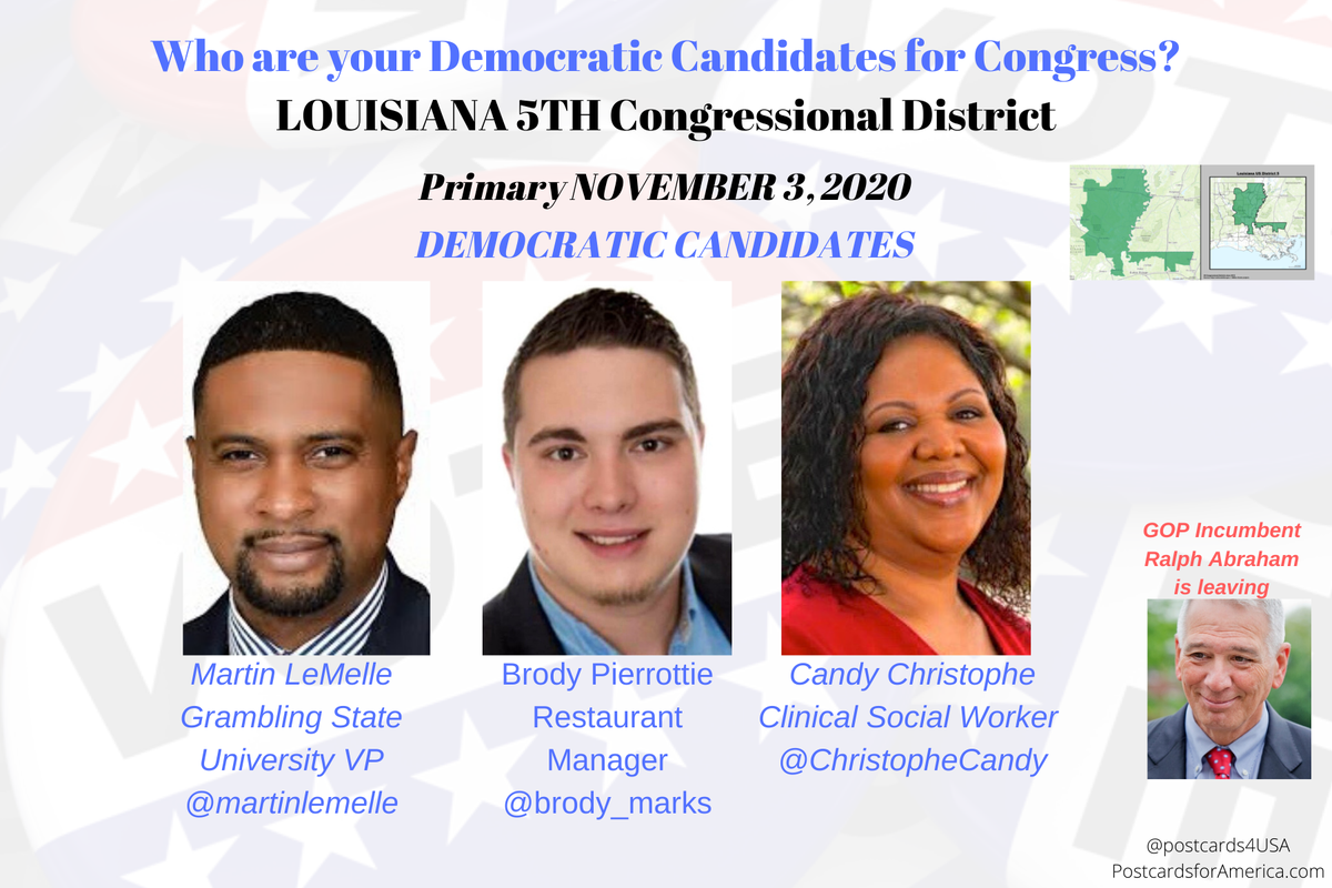 LA5 GOP Ralph Abraham is leaving Louisiana 5th Congressional Distric Democratic Candidates for #LA5 are Martin LeMelle @martinlemelle Candy Christophe @ChristopheCandy Brody Pierrottie @brody_marks #NoSafeSeats #Congress2020 THREAD #PostcardsforAmericapic.twitter.com/yCMyjo7IoE