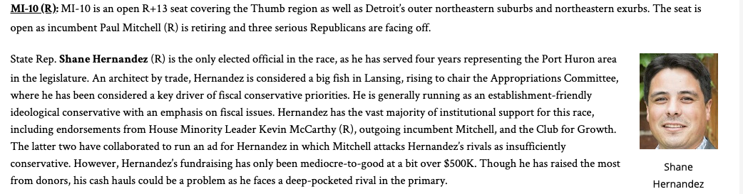 MI-10 is a solid red seat in the "Thumb" part of Michigan. This was held by a Republican woman - Candace Miller, until she retired in 2016.