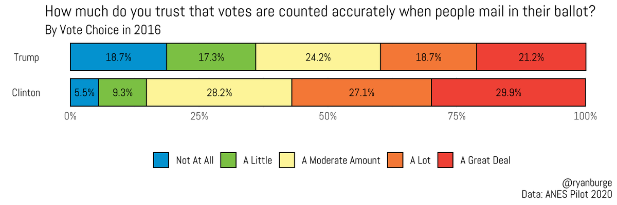 @electionstudies! Someone who voted for Donald Trump is 3 times as likely to say that they have no trust at all in mail in ballots being counted accurately compared to a Clinton voter. Not at all + a little = 36% for Trump voters. 14.8% for Clinton voters.pic.twitter.com/GnnbAHJcih