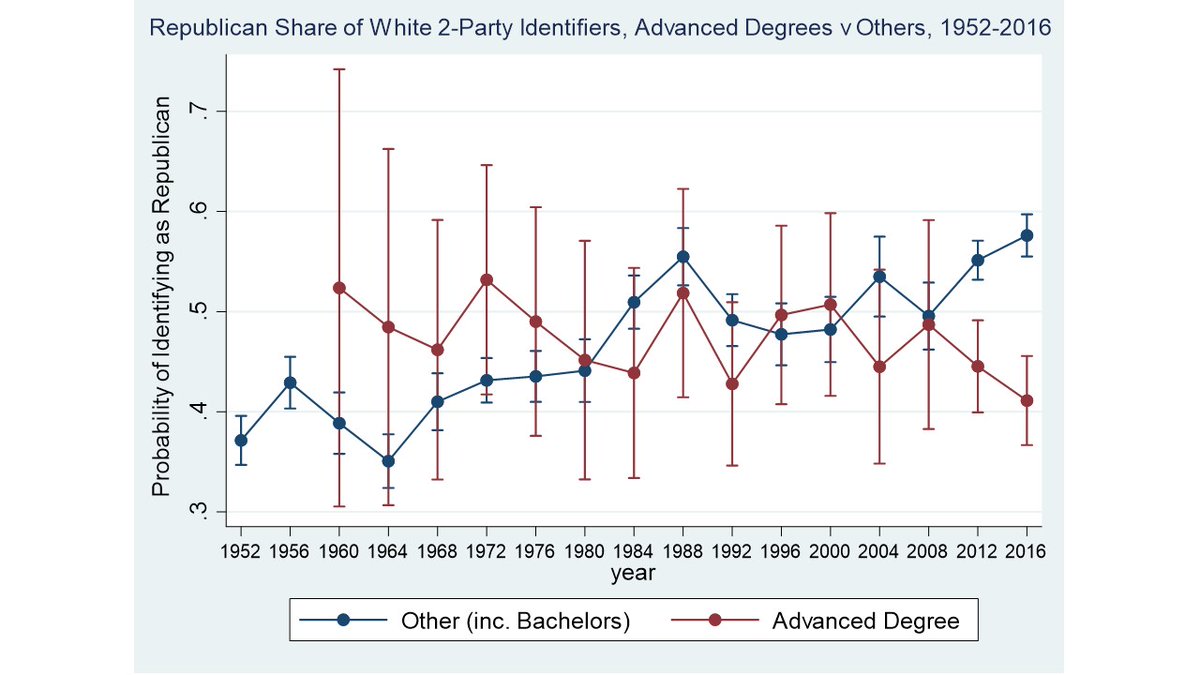 White Americans with advanced degrees (Masters, PhD, LLB) have only diverged from the less educated in party identification since 2008 (controls for age, income, gender, using
