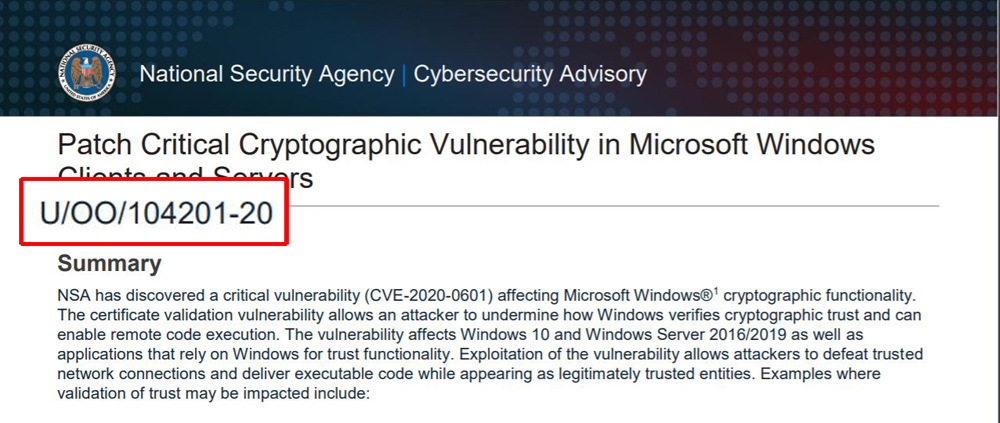 Nice detail: the NSA's recent public report about the Microsoft Windows vulnerability (CVE-2020-0601) has a serial number in the same format as they use for their classified reports:pic.twitter.com/Fo2ThOxWV9