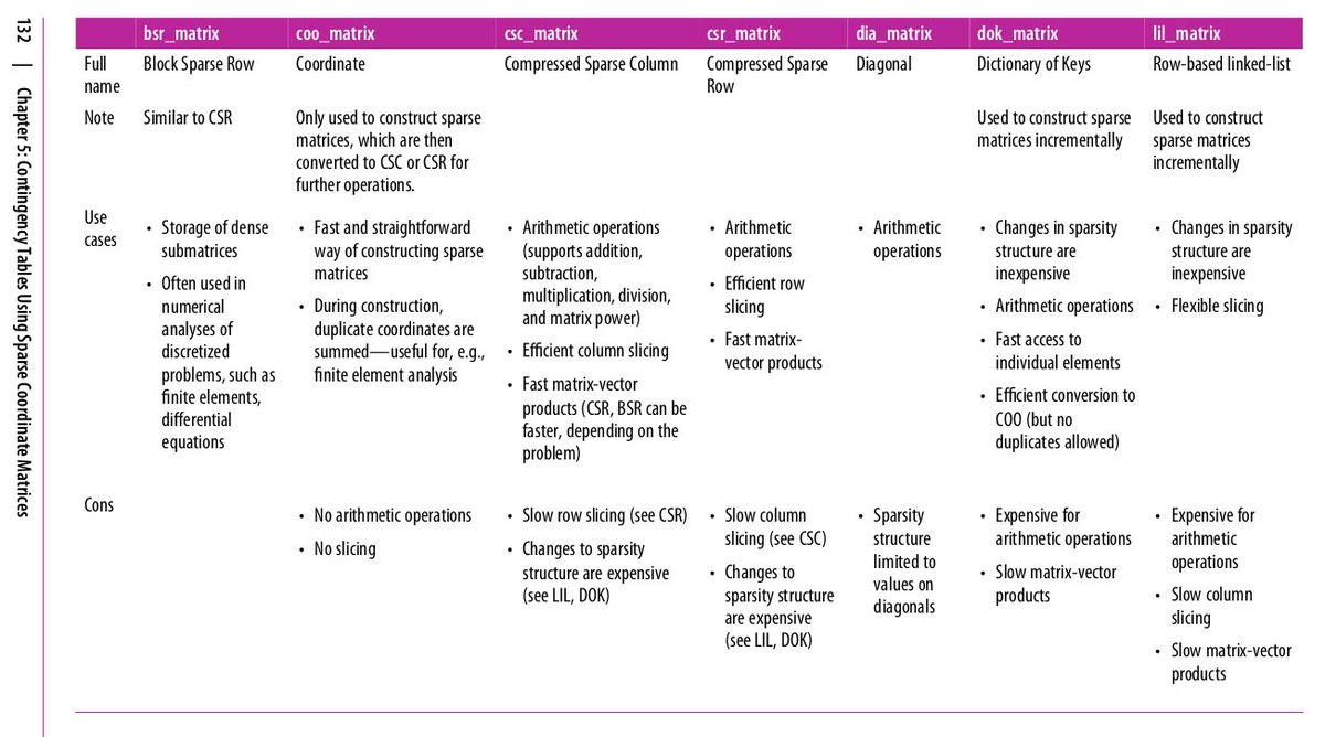 Sparse matrices are useful, but the details matter and can be difficult to sort out. Here’s a good summary of different implementations for scipy.sparse matrices by