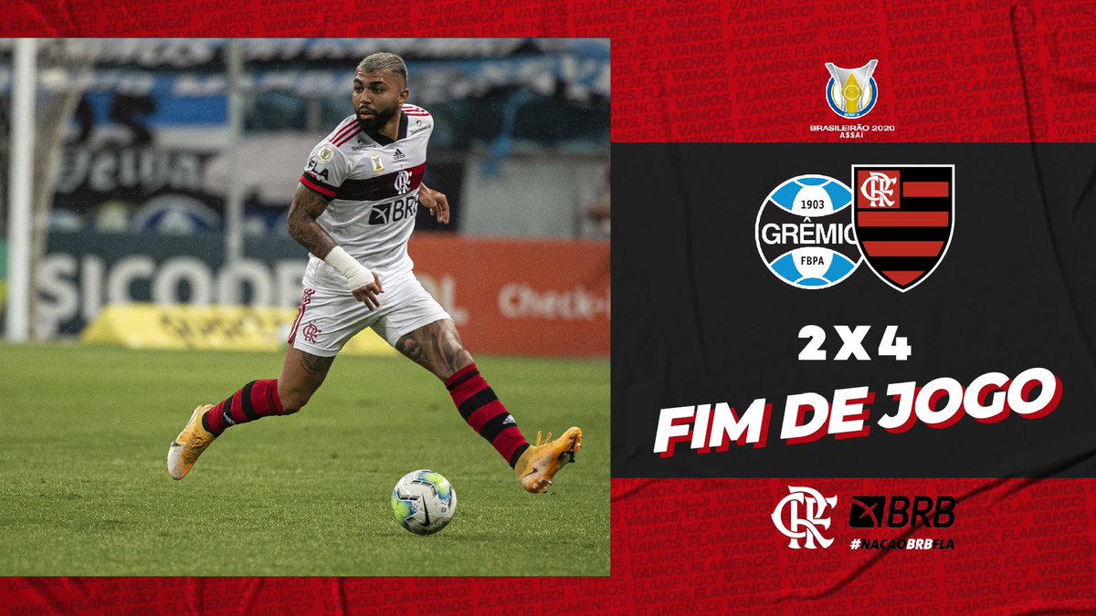 FIM DE JOGO EM PORTO ALEGRE! O Mengão vence o Grêmio, de virada, por 4 a 2, pelo Brasileirão! Everton Ribeiro, Gabigol, Arrascaeta e Isla marcaram os gols do Mais Querido!