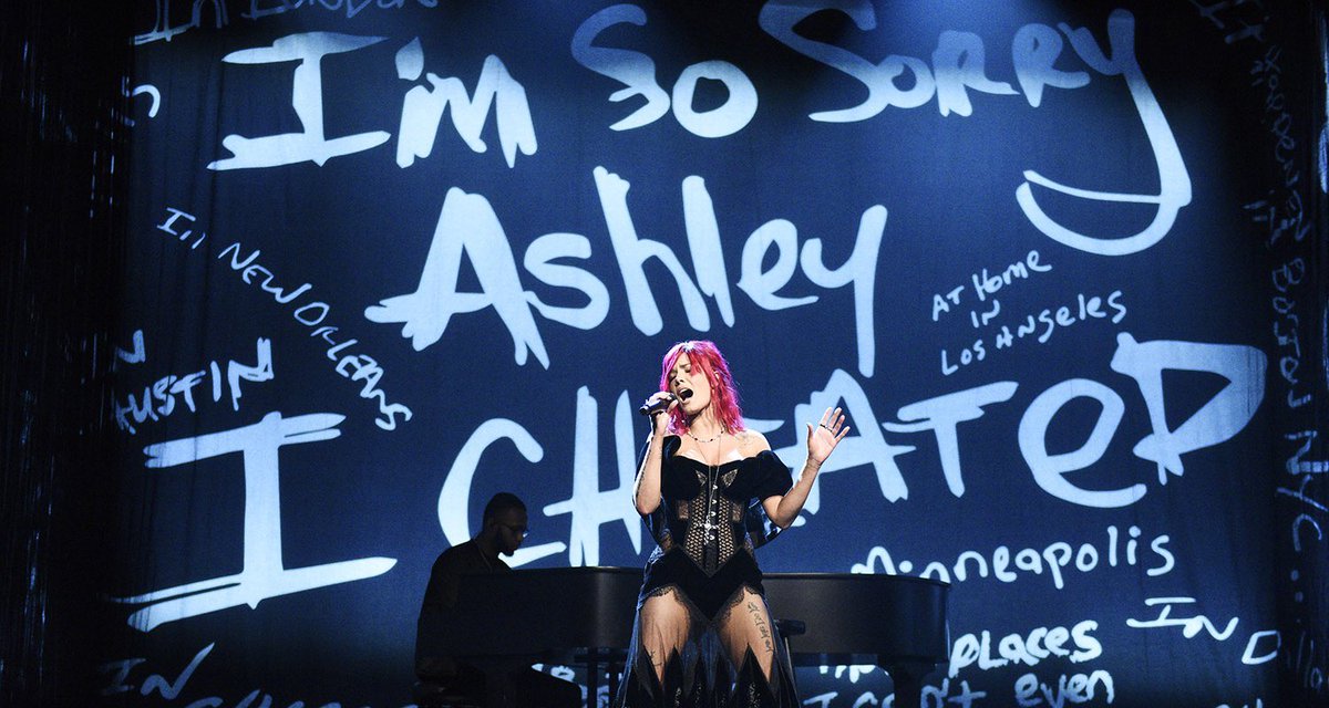 cheated on her a TON! have you seen her Without Me performance on SNL?? she made a backdrop with all the shit he said to her