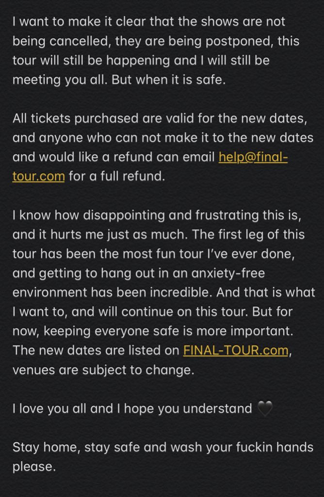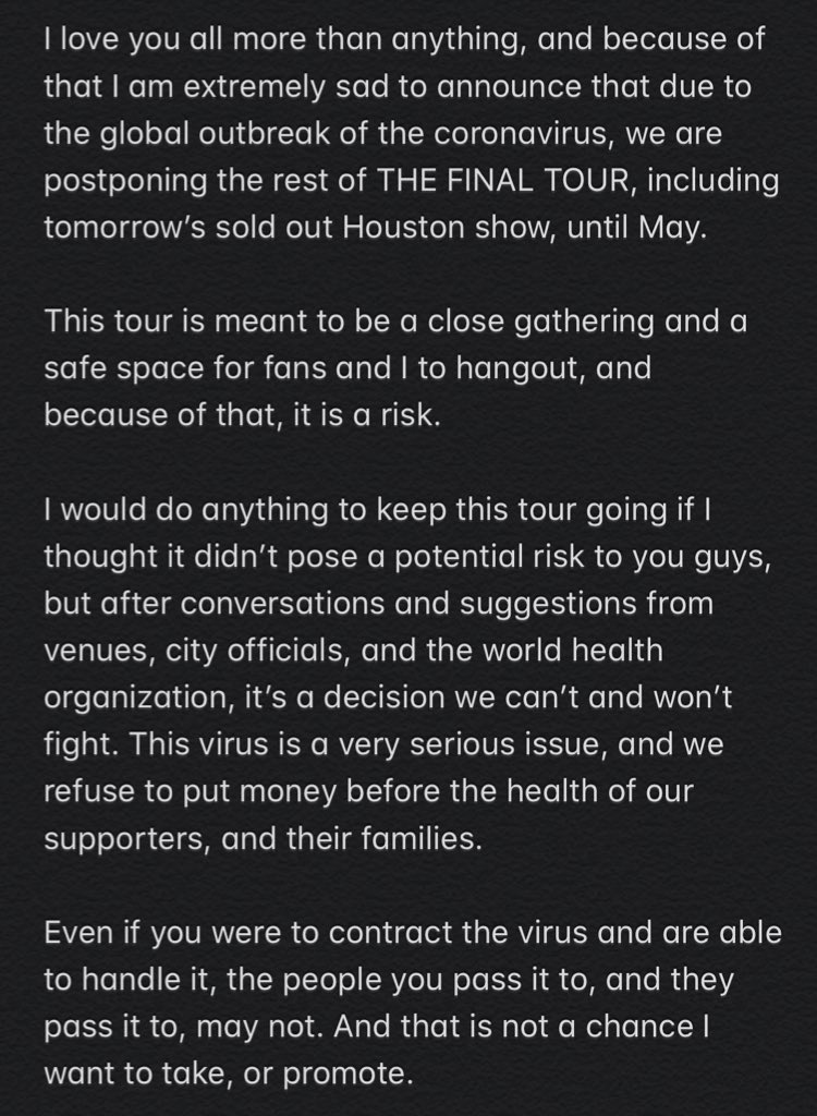 we tried everything, but your guys’ safety is more important than anything. the remaining dates of THE FINAL TOUR, including tomorrow’s soldout Houston show, are being postponed due to Coronavirus. I love you & the show will go on, but when it’s safe for everyone🖤 I’m sorrypic.twitter.com/CA6qRdLFDp