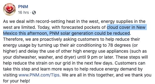 Last night @govmlg touted the NM Green New Deal (aka ETA), that was copied from California politicians. Californians tried warning her about how bad it is, but they don’t have electricity to communicate. Now we see this warning: #nmpol #nmleg pic.twitter.com/2LWPwIDqVT
