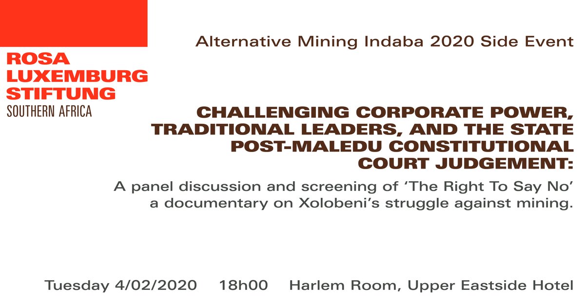 @AltMiningIndaba for a panel discussion and screening of a documentary on Xolobeni’s struggle against mining. 18h00, 04/02/2020.pic.twitter.com/26i04WPWES