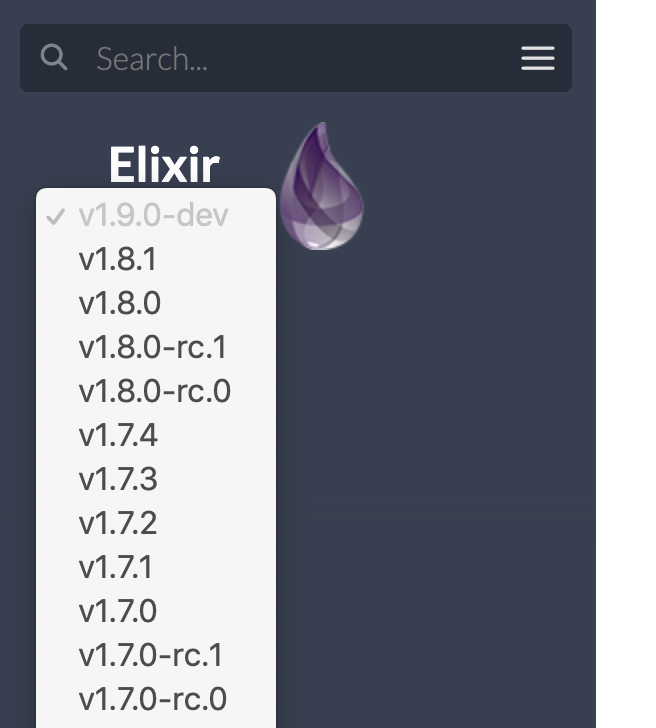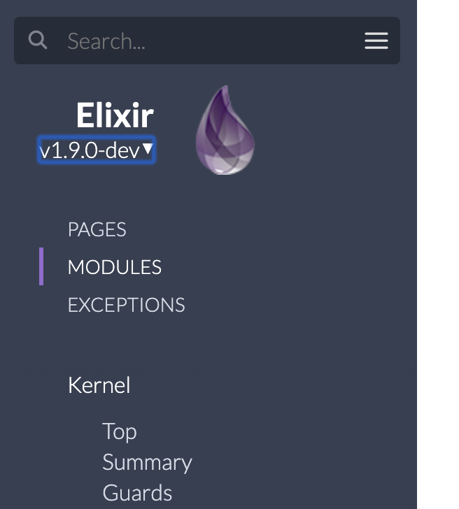 And the latest feature in ExDoc v0.20 is out of the bag: versions dropdown! Screenshots attached. You can also give it a try here: https://hexdocs.pm/elixir/master/ Thanks