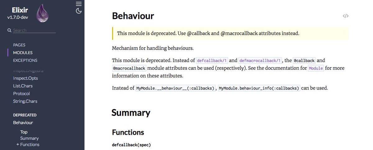 Here is a live example of how ExDoc has been updated to use the "deprecated" metadata to automatically generate warnings on the documentation page: https://hexdocs.pm/elixir/master/Behaviour.html … (screenshots also attached)pic.twitter.com/kFncQIBT2F