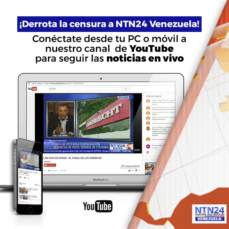 Venza la censura en Venezuela siguiendo nuestra señal en vivo de NTN24 en YouTube: http://bit.ly/2kO6yRC pic.twitter.com/B7M8YsGBMe
