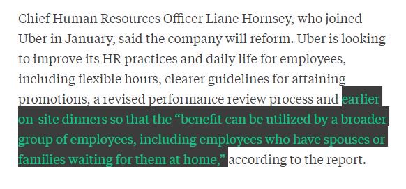 this seems like a small but very good change -- Uber's dinners for employees were super late (8pm, I think?) and didn't accommodate parentspic.twitter.com/vfRSR7W6Hu