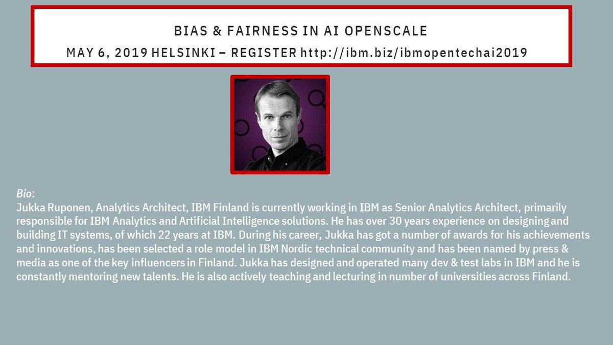 May 6-7 in Helsinki #opentechai #ArtificialIntelligence #MachineLearning keynotes, panels, posters, tutorials-Register & agenda http://ibm.biz/IBMOpentechAI2019 … -Join @ahavasara @AntilaMirva @JimSpohrer @MikaKlemettinen @kimmorossi @geroter @mark_van_gils @adrian_peret @Kopponen & morepic.twitter.com/okkAJhpyhj