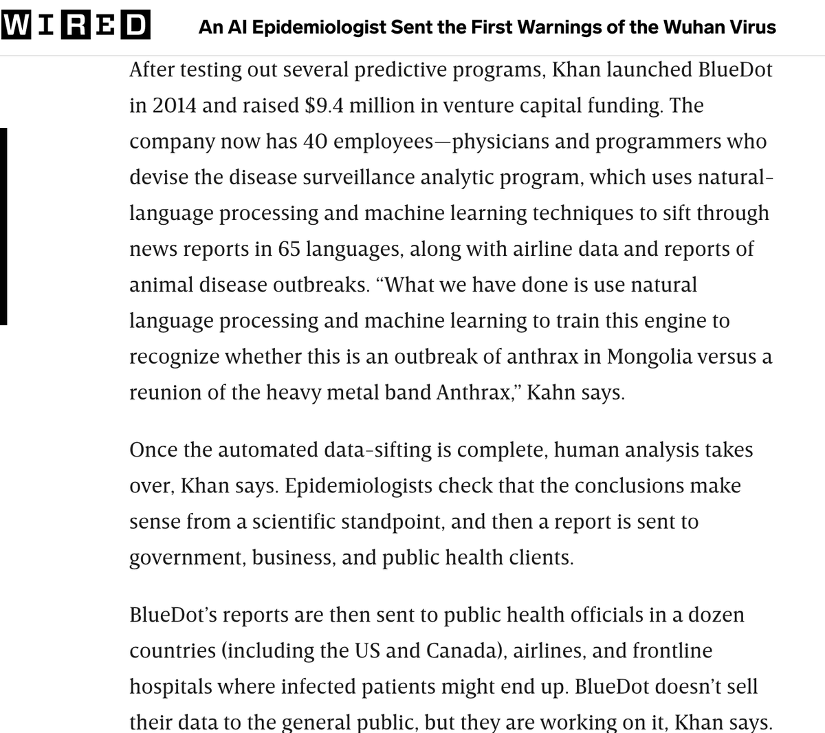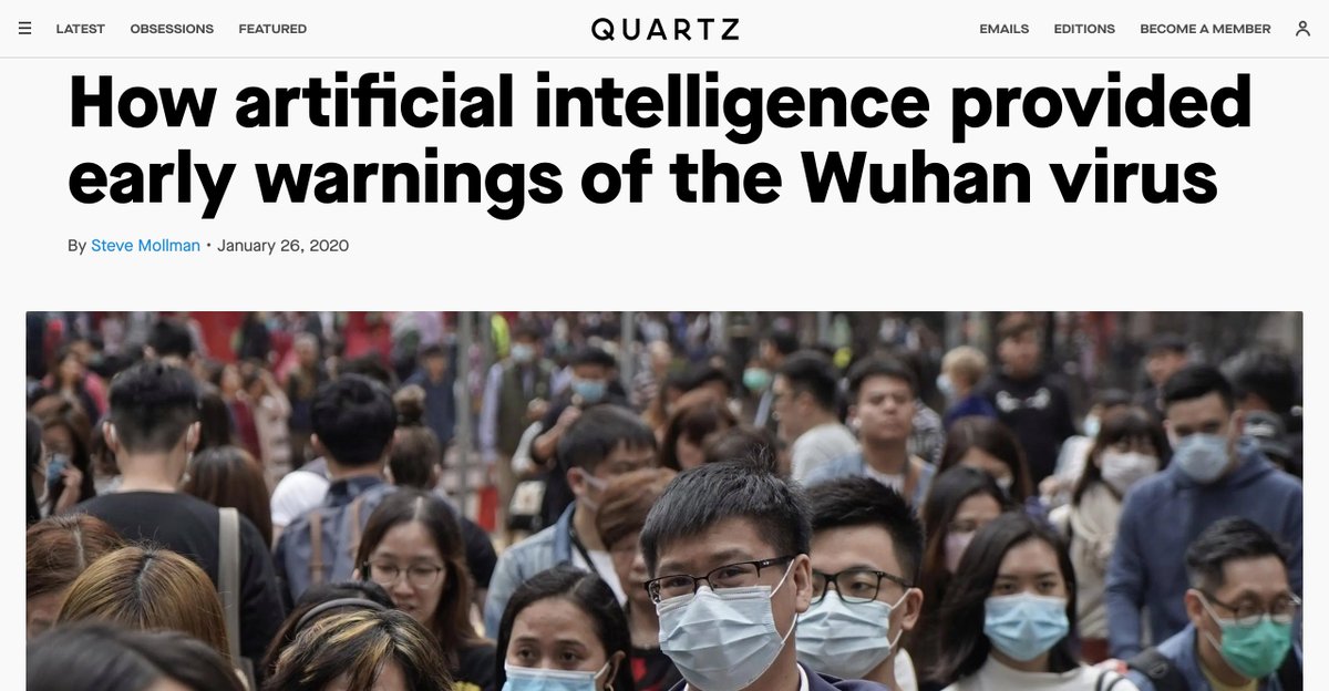في مثال آخر ازاي التكنولوجيا والتحول الرقمي ممكن يساعدنا لتحقيق عالم أفضل وليس شعارات، شركة كندية اسمها Bluedot باستخدام تحليل البيانات الضخمة والذكاء الاصطناعي قدرت تتوقع/تكتشف وترسل تنبيهات بمرض "كورونا" قبل منظمة الصحة العالمية!pic.twitter.com/3aAnfDXiHy
