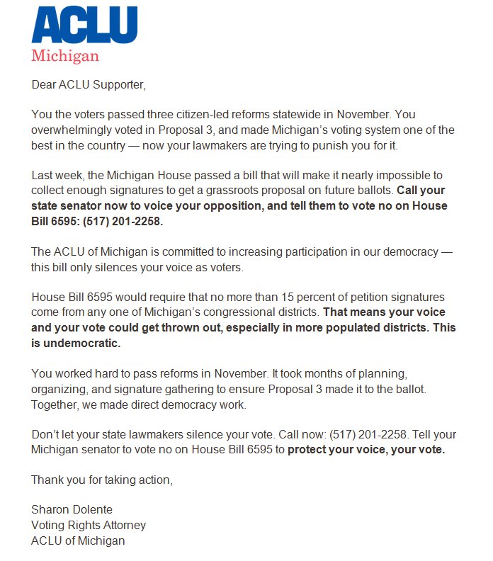 Protect your voice and your vote. Be ready to act this week to tell your MI senators to OPPOSE House Bill 6595. If it passes the MI senate, this would make collecting enough signatures to get citizen-led reforms on future ballots nearly impossible.https://www.freep.com/story/news/politics/2018/12/13/ballot-proposals-michigan-lame-duck/2297824002/ …
