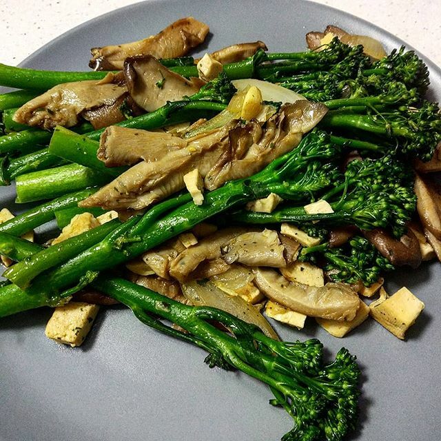 Setas al ajillo con bimi de @mercadona Riquísimo,con un poquito de tofu, pimentón picante, aceite de oliva y sal