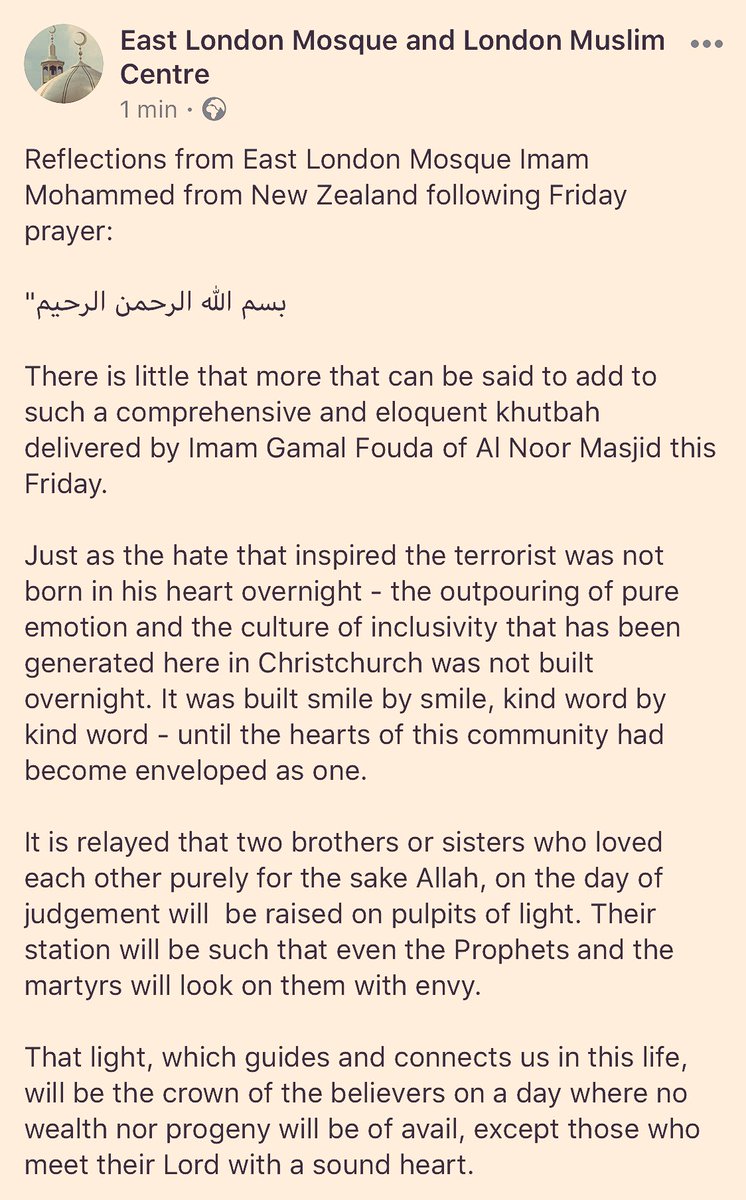 Reflections from East London Mosque Imam Mohammed from New Zealand following Friday prayer: Read here: https://www.facebook.com/88702871881/posts/10157224400956882?sfns=mo …
