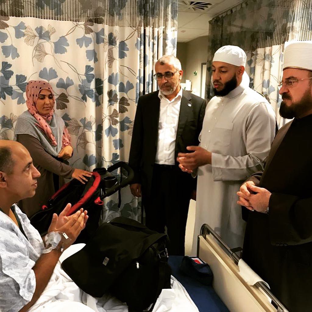 Imam Mohammed Mahmoud of East London Mosque, visits some of the injured in hospital in New Zealand and presents flowers to staff as a thank you for their commendable efforts following the shootings in the two mosques