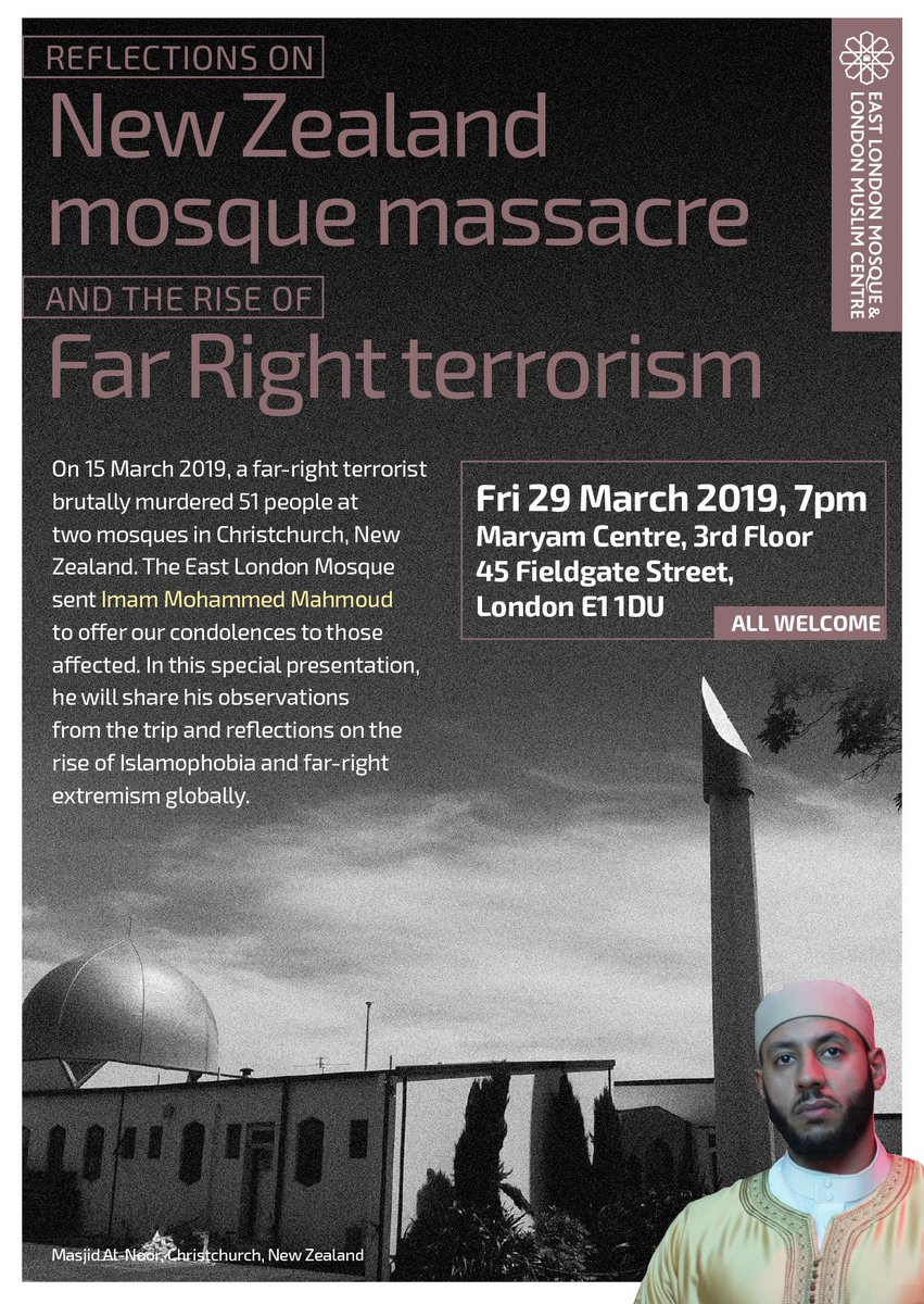 Reflections on New Zealand mosque massacre & the rise of Far Right terrorism Friday 29th March, 7pm Maryam Centre, 3rd Floor 45 Fieldgate Street London, E1 1DU ALL Welcome