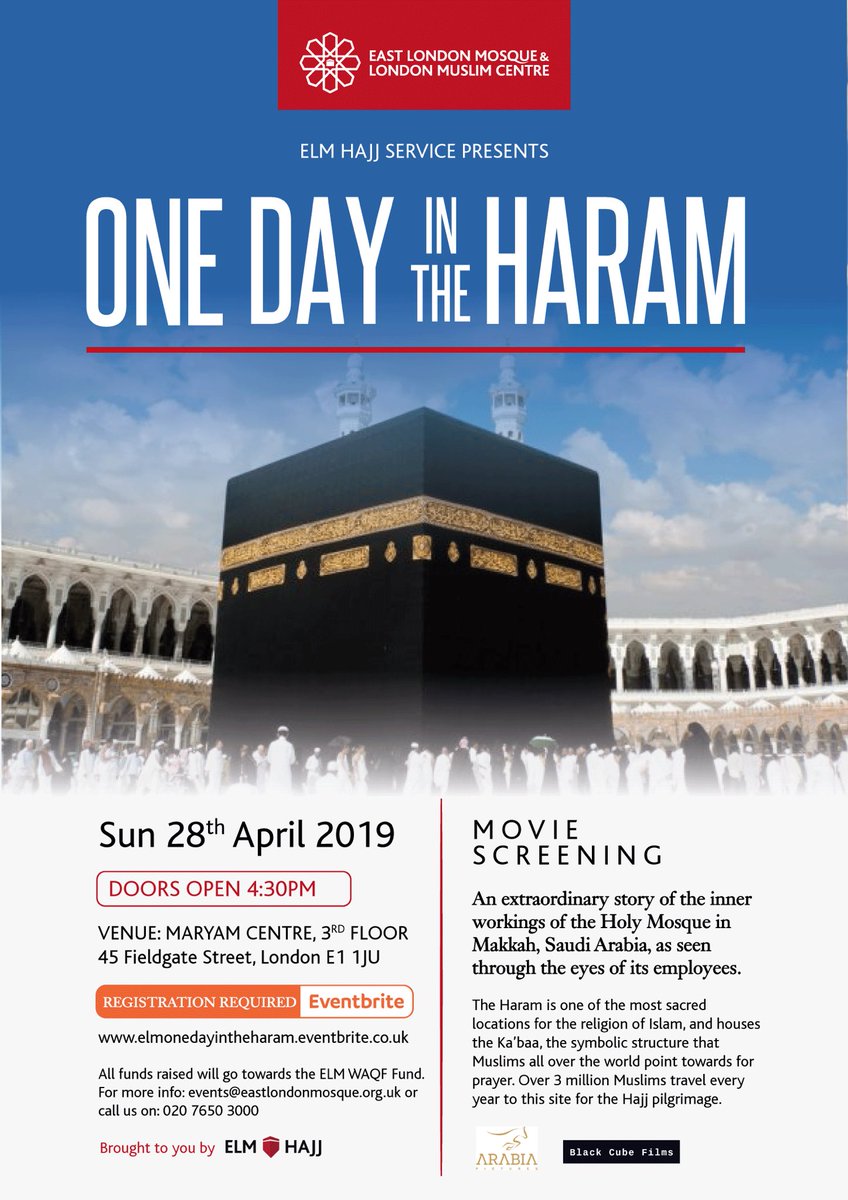 ELM Hajj Service presents: 'One Day in the Haram' - Movie Screening for the first time at the East London Mosque & London Muslim Centre Sunday 28th April | Doors open 4.30pm. REGISTRATION REQUIRED http://www.elmonedayintheharam.eventbrite.co.uk ALL WELCOME | LIMITED SEATSpic.twitter.com/NSMS1naISF
