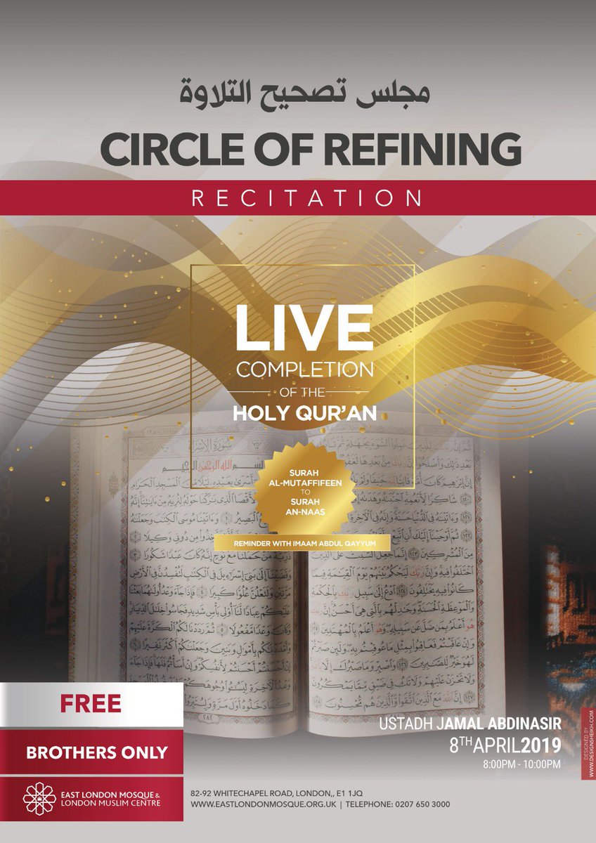 Join us for the khatmal Qur'an (completion of the Qur’an) on Mon 8th April after Maghrib prayer 7:53pm, in East London Mosque Main Hall with Ustadh Jamal AbdiNasir Alhamdulillah, after almost 2 years, Allah has given us the ability to reach the completion of this recitalpic.twitter.com/MJJsjNGBak – bij East London Mosque & London Muslim Centre