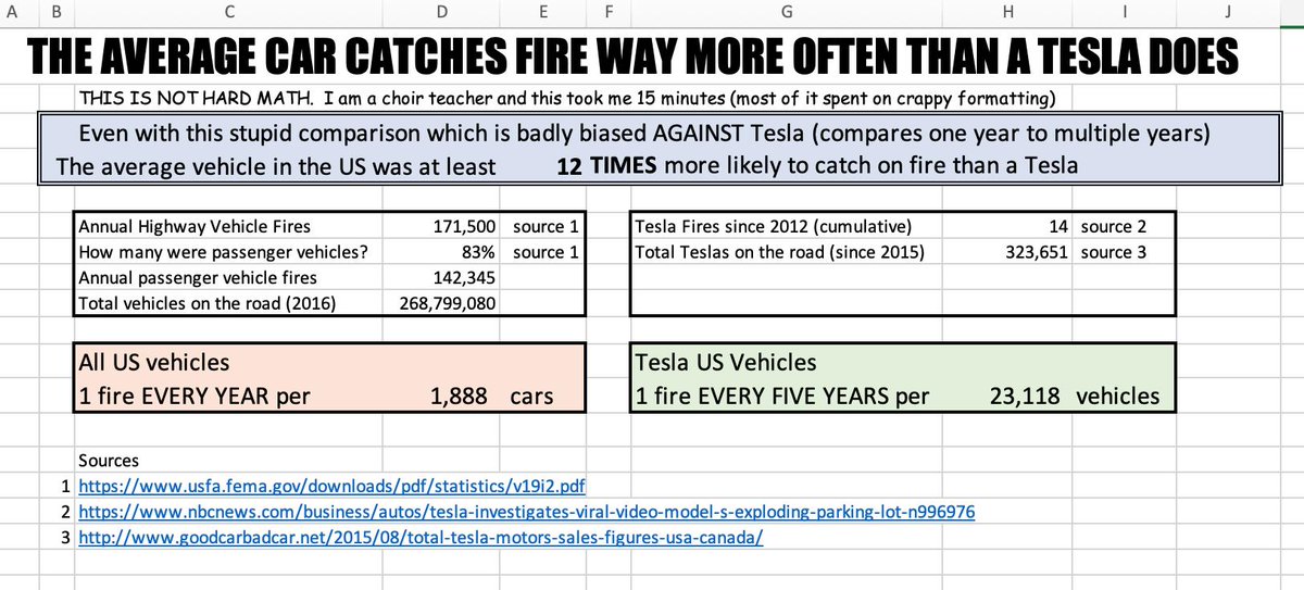 Source: https://redd.it/bg2rib Even though they do have less cars on the road, if you compare them statistically. On average and in a sense, in a "per capita" basis. The average car still catches on fire way more often than an Tesla. And EVs in general.pic.twitter.com/V3eflv1tcP