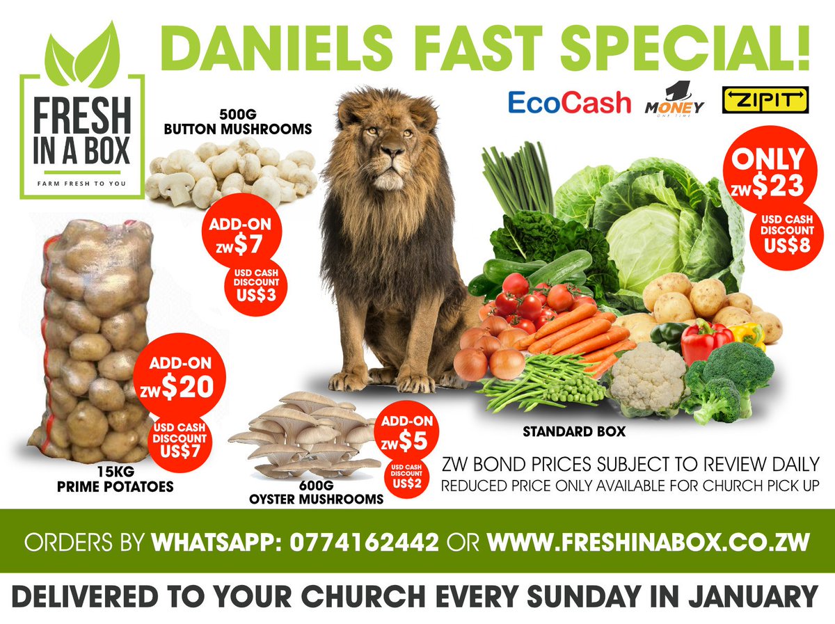 Daniel's Fast special. zw$23 ONLY! Delivered to Churches this Sunday and every Sunday. Order now via our super simple website http://freshinabox.co.zw or using whatsapp 0774162442 ( easy link if u are using a phone http://wa.me/263774162442 )pic.twitter.com/kG96UumAV1