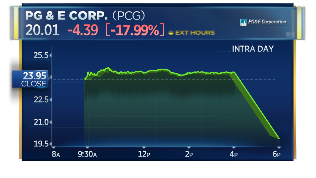 BREAKING: PG&E plunges 18% after Reuters reports that it is exploring filing some or all of its business for bankruptcy protection as it faces billions in liabilities related to fatal wildfires. https://www.cnbc.com/quotes/?symbol=PCG …pic.twitter.com/dbS0r1buMU