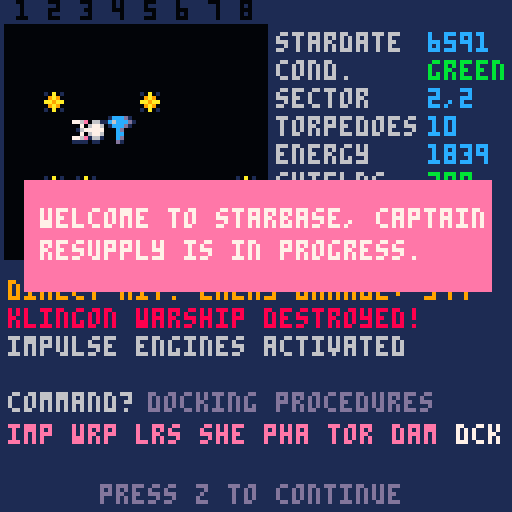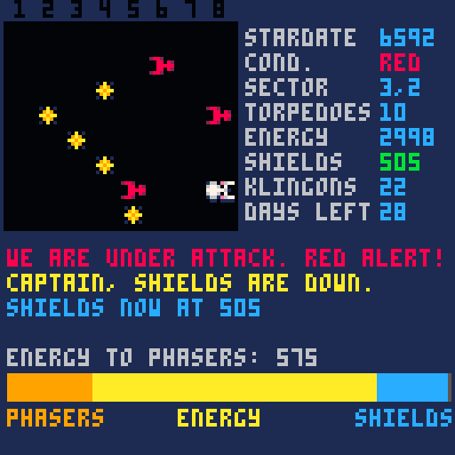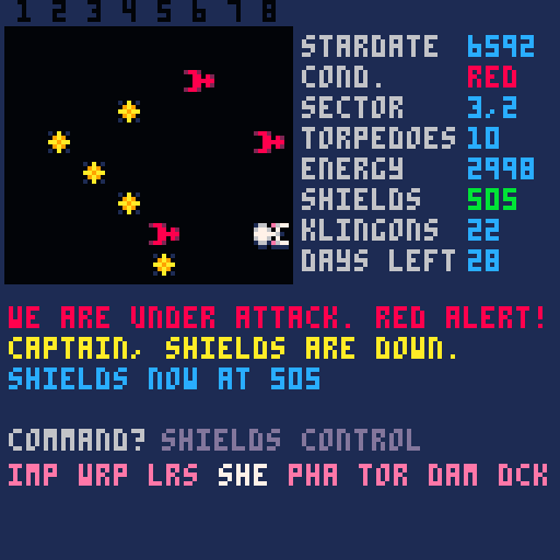 Star Trek P8 v1.0 is out. I'm very happy about the new cover and the starfield effect during warp. You can play it in your browser here: https://emabolo.itch.io/star-trek-p8 and let me know your comments!