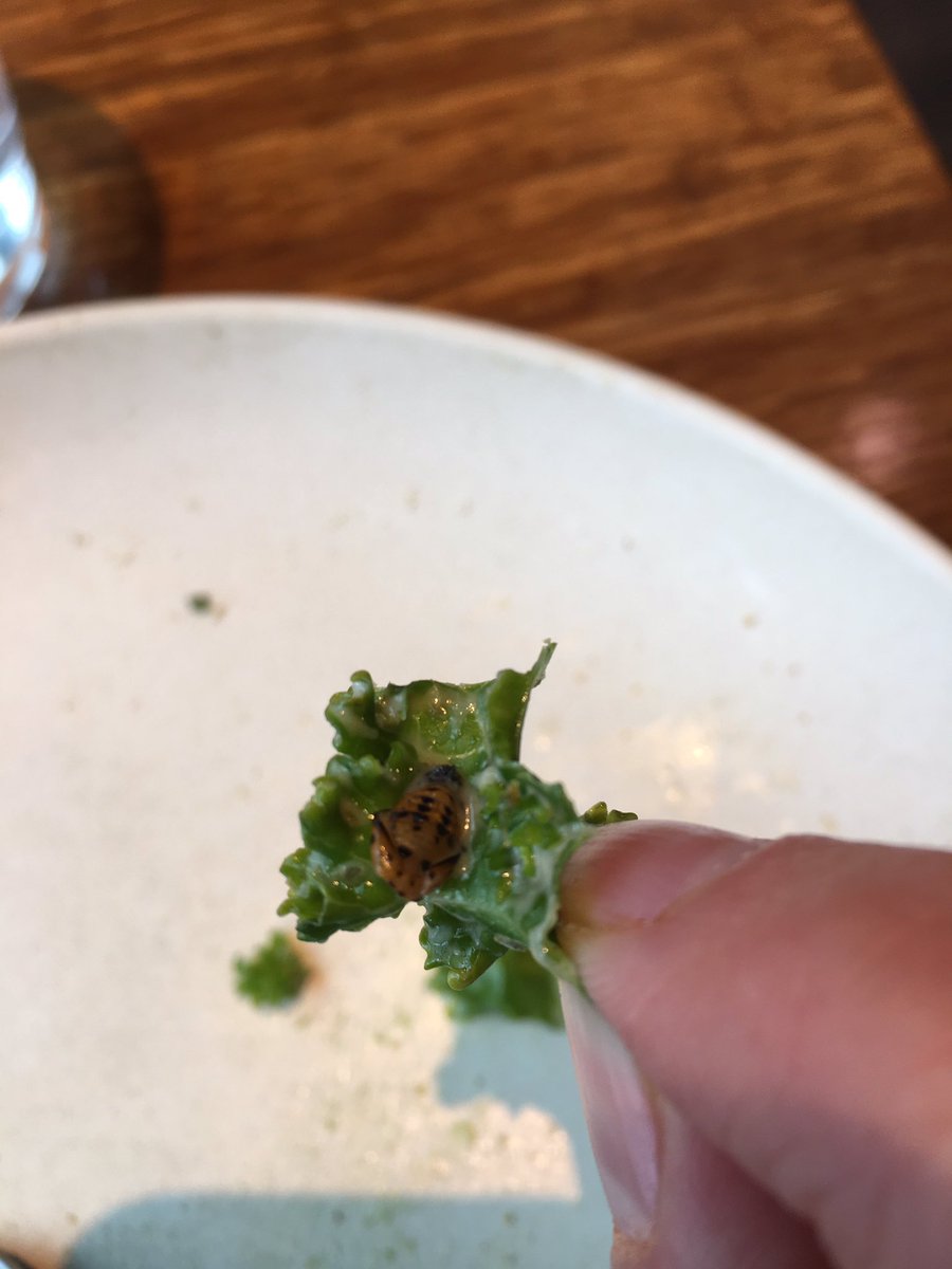 Just discovered this dead bug in my kale salad. It’s been one of those kind of days. They were super nice about it... refunded me and gave me two free entree gift certificates. But — I am thoroughly grossed out.pic.twitter.com/rM2OKk7rYa