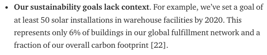 This piece sounds like it was written by Amazon's own PR. Those 51 solar rooftop projects? That's only on ~6% of buildings in our global fulfillment network. In other words: *94% DON'T have them.* We called this out in our (